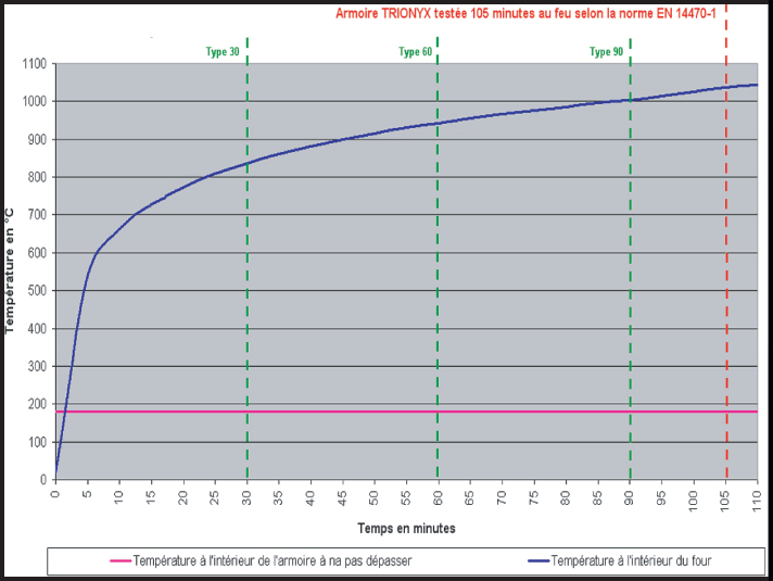 1. Protection contre l’incendie : En cas d’incendie, l’armoire doit garantir que, pendant au moins 30 minutes, son contenu ne contribuera pas à accroître les risques ou la propagation du feu. 3 classes ont été définies par la norme pour permettre à l’utilisateur de choisir l’armoire la plus adaptée à ses besoins et au niveau du risque évalué.