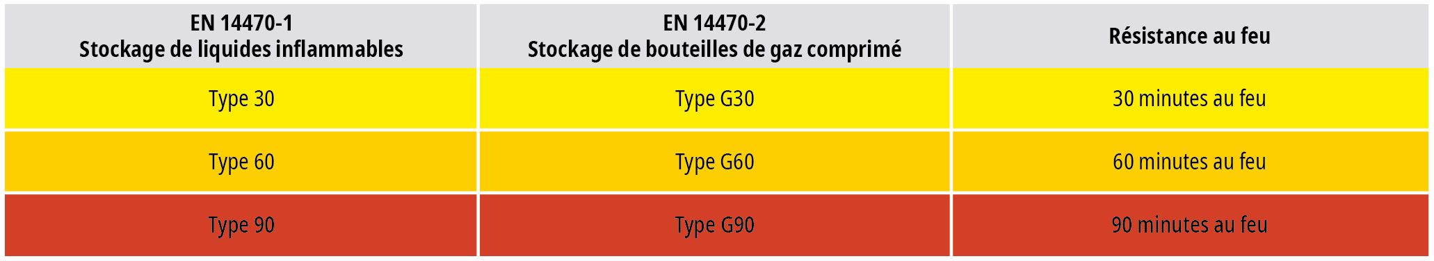 - EN 14470-2 : présence de bouteilles de gaz comprimé, résistance au feu du modèle (30, 60 ou 90 minutes), maintient des portes fermées lorsque l’armoire n’est pas utilisée.