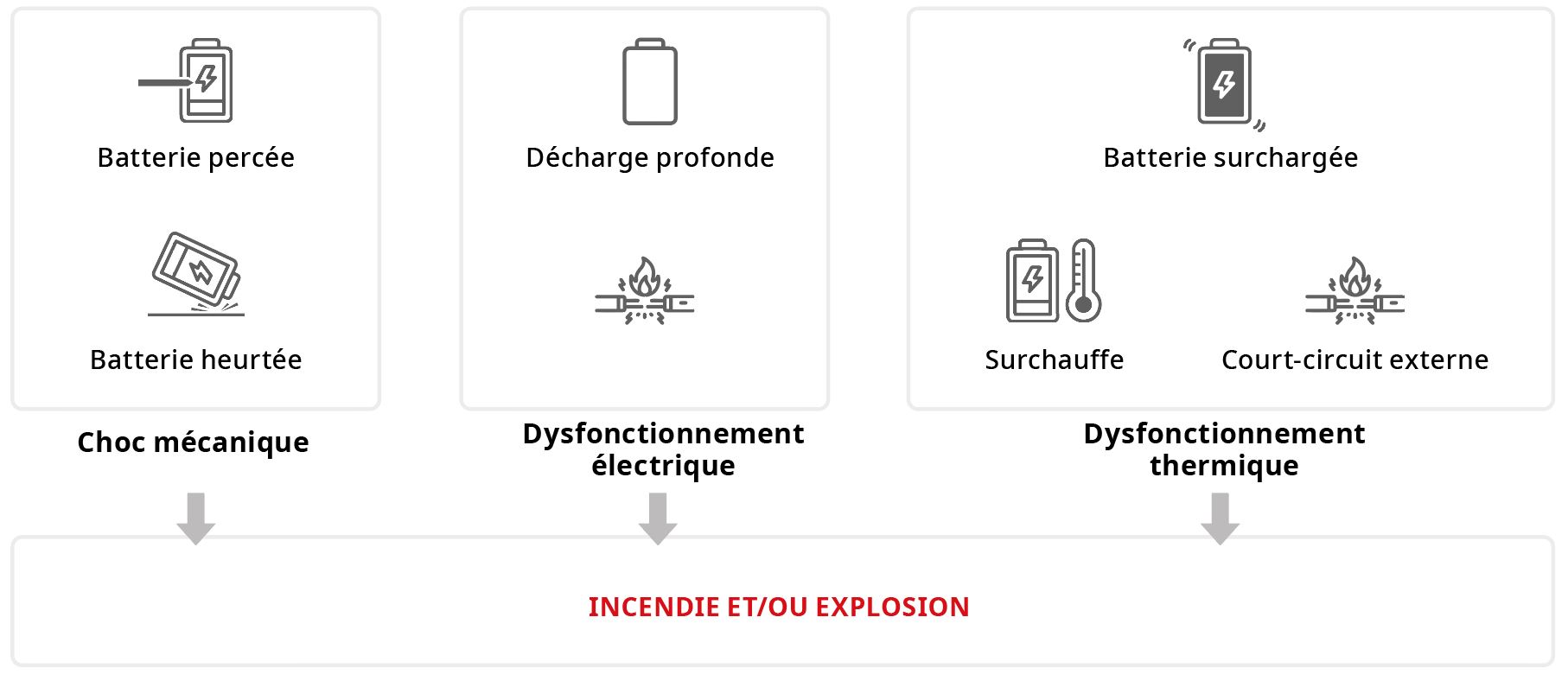 Ces trois grands risques sont favorisés par différentes anomalies principalement liées à un défaut d’utilisation ou à un défaut de la batterie elle-même.